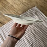 Details: the base is not very high, there are cracks in the earthenware, and a chip on the edge. - Round, hollow dish on a stand